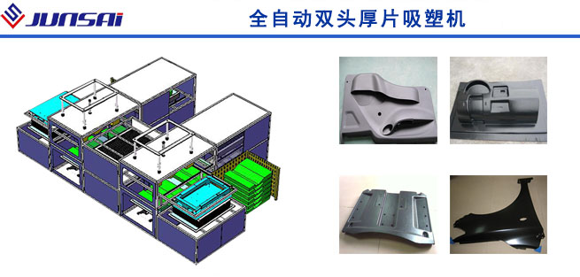 全自動雙頭厚片吸塑機是由上海駿精賽自主研發的大型雙工位厚板真空吸塑設備,主要用于汽車內飾等大型板材厚吸塑件加工成型。這臺機器有兩個吸塑工位、兩個上料工位、一個加熱爐、兩種加熱模式:自動上料和手動上料。